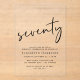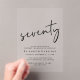 Chic clear acrylic invitation for your 70th birthday party featuring "seventy" in a large script, your name in elegant serif typography and the party details in simple, modern lettering,
