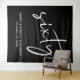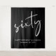 Chic black tapestry backdrop for your 60th birthday party welcome sign and photo prop featuring "sixty" showcased in a large white script and your name and the date in modern white lettering.