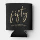 Fun black can coolers for your 50th birthday party featuring "fifty" showcased in a chic gold script and your name in modern gold lettering.