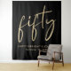 Chic black 50th birthday party tapestry backdrop, welcome sign and photo prop featuring "fifty" showcased in a stylish gold script and your name and the date in modern gold lettering.