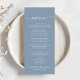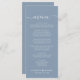 Modern dusty blue menu for your wedding reception, engagement party, rehearsal dinner and other wedding celebrations featuring "menu" in a chic white calligraphy script with swashes, your customised menu in simple white typography, your first names joined by a heart and your event date.