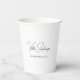 Elegant paper cups featuring a custom home or villa name in chic calligraphy script with a location line beneath. The clean white cup with delicate grey typography creates a sophisticated, modern look for entertaining at vacation homes, rental properties, or special events. All text is fully customisable.