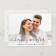 Modern light cream save the date announcement postcard. Your photo is overlayed with "happily ever after" in a chic script with swashes and your first names and wedding date are joined together by a heart. On the back, personalise your save the date message in elegant typography and input your wedding website address to create a QR code for your guests to scan for wedding updates and details.