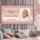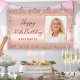 Elegant Modern Sparkle rose gold glitter metal Personalised Photo Happy 50th Birthday Party Banner. This Girly Adult feminine FIFTY (FIFTIETH) Birhday party decor featuring "Happy 50th Birthday" (OR ANY AGE) text in a stylish handwritten calligraphy script and custom name on blush pink or rose gold faux brushed metallic foil background with loose glam glitter frame around. Ideal for a feminine adult or girly milestone birthday celebration, this perfectly captures the essence of a modern rose gold or blush pink glitter sparkle girly birthday party. Perfect for a welcome banner or even a party decoration.