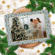 This holiday card is distinguished by its unique and elegant design. It features a classic "Merry Christmas" greeting printed in real gold foil, enhanced by a wintery pattern of red Holly berries and teal green pine needles on a light grey blue background. On the front of the card, there is space for you to include your family name and the current year. The back provides an excellent opportunity to add a personalised seasonal greeting or poem, making your message truly memorable. This card is the perfect choice for conveying your holiday wishes in style.