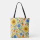 This beautifully designed tote bag, inspired by Mediterranean Italian style, features a vibrant floral and leaf pattern in shades of yellow, orange, blue, red, and green. There is ample space for customisation, allowing you to add your name, monogram, or initials.