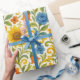 This beautifully arranged classic Mediterranean Italian design features a vibrant yellow, orange, blue, red, and green floral and leaves pattern. It is perfect for wrapping gifts for fun birthdays or any special occasion—just because! The design is ornate, stylish, and eclectic, making it appealing to artistic crafters and enthusiasts of vintage retro styles. It is available on a variety of modern craft and office products, including wrapping paper, tissue paper, gift tags, bags, favour boxes, ribbons, and envelopes.