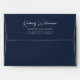 Chic blue return address envelopes for your business featuring your name or brand showcased in a modern white signature script, your company or title in simple white lettering, and your return address in classic white serif typography.