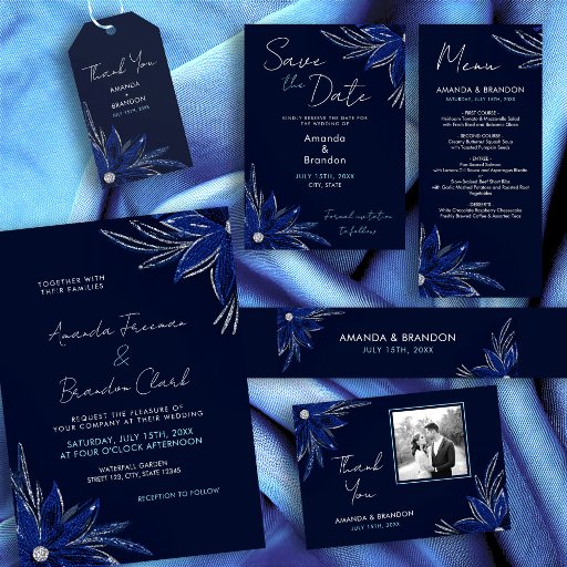 An elegant wedding layout featuring deep navy blue flowers accented with silver glitter detailing. A sophisticated and modern design perfect for evening ceremonies or formal celebrations.