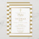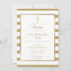 Chic gold and white striped baptism or christening invitation featuring an elegant faux gold foil border framing your details set in chic typography with a simple gold cross. Designed by Thisisnotme©