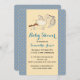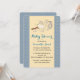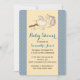Stylish baby boy shower invitation done in a pale golden yellow, with a golden yellow on turquoise blue star pattern, running down both sides. Lovely graphics of a stork flying with a baby bundle, decorates the top of the invitation. Personalise the turquoise blue and dark grey text for your baby shower event. Lovely invitation the mum-to-be will cherish.
