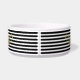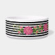 Chic white ceramic pet food / water bowl, with graphics of a black and white horizontal stripe pattern. Graphics of a band of pink roses, runs across the middle and a decorative text area, on the front, has black text ready to personalise, for your pet or as a great gift idea for any pet owner. Matching pet bed available.