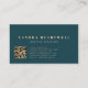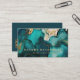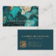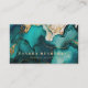 This dark, moody modern business card features an alcohol ink and faux glitter abstract painting in teal blue and gold. Personalise it with your name in chunky gold-coloured serif font and your business information in sans serif font. The back of the card features gold-coloured text on a solid deep teal background, along with a QR code that directs customers to your business website.