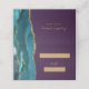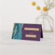 This elegant, modern wedding table reserved seating place card features a teal blue watercolor agate border trimmed with gold faux glitter. The front of the card provides spaces for the guest's name and table number. The word "table" appears in gold-coloured handwriting script with swashes before and after on a purple background. Customise the back of the card with the names of the bride and groom in gold-coloured handwriting script and the wedding date below.