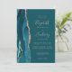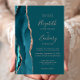 The left-hand edge of this elegant modern wedding invitation features a teal watercolor agate border trimmed with faux rose gold glitter. The customizable text combines rose pink handwriting, copperplate and italic fonts on a teal background. The reverse side features a matching teal and rose gold agate design.