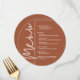 A round terracotta dinner menu card features your menu choices in chic white lettering, perfect for a modern wedding reception, wedding rehearsal dinner, anniversary party or any special event with a sit-down dinner. Easily personalise with your dinner menu and details. MORE colours in our store.