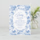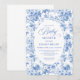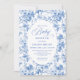 Create a timeless first impression with this baby shower invitation featuring elegant French toile de jouy roses in refined shades of navy blue, royal blue, dusty blue, and deep blue, inspired by classic chinoiserie floral design. This sophisticated style blends heritage elegance with modern charm, making it perfect for a memorable baby shower celebration.