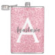 Chic and glam blush pink rose gold glitter sparkles metallic flask, with a large, white monogram initial and your custom name in an elegant grey script font. Personalise this trendy flask with your name or monogram initial. You can change the text colour and font style and size using the customise option.