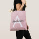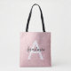 Chic and glam blush pink rose gold glitter sparkles metallic tote bag, with a large, white monogram initial and your custom name in an elegant grey script font. Personalise this trendy bag with your name or monogram initial. You can change the text colour and font style and size using the customise option.