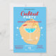 The invitation’s graphic style is contemporary and engaging, with a bold blue backdrop that makes the white and yellow text pop. The use of clean, sans-serif fonts adds a touch of modernity, ensuring the details stand out and are easily readable.