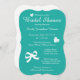 Elegant turquoise blue and white bridal shower invitations. Custom wedding party invites with little white hearts and bow ribbon. Customise cutout shape. Custom background colour. Beautiful stylish script text with vintage love symbols. Classy design with registry for bride to be.