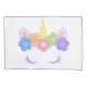 Stylised unicorn design with horn, ears, eyes, and flowers.