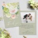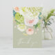 Beautiful watercolor of white and green hydrangeas with pink and cream roses, daisies, small blossoms and leaves are featured on the front of these sage green wedding thank you cards. Your photo and message are printed on the back. MATCHING items in our collection.