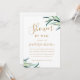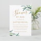 Trendy typography and chic watercolor greenery leaves with gold colour text on a white baby shower by mail invitation. This modern invitation is an elegant way to invite friends and family to shower the mother to be with gifts and loving thoughts from afar. Perfect for a baby boy or girl.