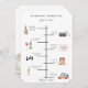 Chic and trendy colourful watercolor wedding day elements, timeline program. Card features church, camera, bottle with glass, plate setting, music notes, cake, bouquet, and retro car. Back of card features dried botanical arrangement of palm fronds, anthurium, roses and orchids. Text font style and colour can be customised.
