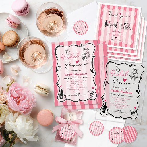 Celebrate the bride-to-be with this chic hand-drawn bridal shower tabletop sign. Featuring whimsical illustrations in contrasting black, casual handwritten script-inspired fonts, girly bows, and pink hearts with a retro flair, this elegant acrylic sign is perfect for a stylish champagne brunch, a romantic wedding shower, or a unique garden party for a soon to be bride. Feel free to reach out if you need any help with customisation.