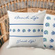 Personalise this Stripes Beach House Throw Pillow with your Family Name, the epitome of Coastal Chic for your seaside retreat. Featuring Elegant Shells and Fish this pillow exudes Ocean charm and tranquillity. Complemented by Thin Navy Blue Stripes against a Crisp White background, this Beach House Decor evokes a classic Nautical aesthetic. Also perfect as a Stylish Beach Housewarming gift.