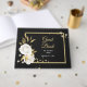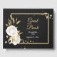 beautiful elegant white flowers with some gold leaves chic black guest book.