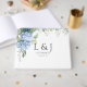 Chic & elegant off-white wedding guestbook in a modern, youthful style with voluptious blue hydrangeas in full bloom. The front includes couple names & initilas in dark grey and wedding date, against a white background. The spine features the text 'our wedding guestbook', also in dark grey. A beautiful and special keepsake. Personalise this special and unique design to make it your own unique personal keepsake.