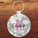 Chic white marble stone custom name monogram round button keychain. Classy script typography and classy background texture. Elegant design for men women and kids. Monogrammed with your personalised initial letter. Cute Birthday gift idea for dad, father, mum, mother, husband, wife, son, daughter, wedding bride, bridesmaids, crew, team, entourage etc. Also nice as party favour at luxury weddings, reunion, graduation etc. Luxury style. Pink or custom colour.