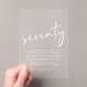Chic clear acrylic invitation for your 70th birthday party featuring "seventy" in a large white script, your name in elegant white serif typography and the party details in simple, modern lettering,