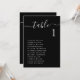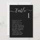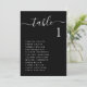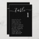 Chic black wedding seating chart card featuring "table" in an elegant white script, the table number in classic white serif typography and your guests' names in simple modern white lettering. Create each table seating chart and add to your shopping cart one at a time, then check out once all tables are in your cart.