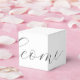Chic and stylish. This wedding favour box features a contemporary dark grey brush script font in text of your choice. Choose to say 'Thank you or Welcome'. A little message is included at the back for guests along with wedding date and couple names. The favour box is dressed up in crisp clean white jacket. Personalise to make it you very own special gift.