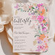 A little butterfly is on its way! Romantic pastel wild flowers spring summer baby shower with pretty wild country flowers with hand painted golf glitter butterflies in pastel colours and flowers in pink, peach, purple, lavender, green leaves and more, with a brushed script typography on an elegant editable soft pastel pink background.