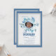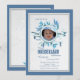 A chic, watercolor, winter invitation featuring frosted pine branches and cones in shades of blue. The round photo window is framed and ready to hold your child's photo.