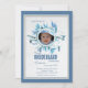 A chic, watercolor, winter invitation featuring frosted pine branches and cones in shades of blue. The round photo window is framed and ready to hold your child's photo.
