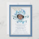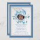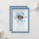 A chic, watercolor, winter Baptism invitation featuring frosted pine branches and cones in shades of blue. The round photo window is framed and ready to hold your baby's photo. The featured cross can be dragged to any location, made larger or smaller (+-) or eliminated.