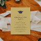 This chic yellow grad cap graduation party invitation is perfect for a modern outdoor party. The simple design features classic gold yellow and black typography with a black and gold watercolor graduation hat.