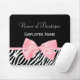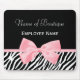 Decorate your boutique storefront with this chic and stylish zebra print mousepad with a soft girly pink ribbon tied into a cute bow. Personalise this trendy black and white animal print boutique office accessory by adding the name of the salesperson and company. Flat printed image, not actual ribbon.