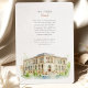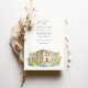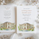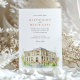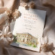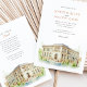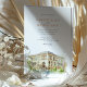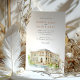 Invite your guests to a sophisticated city celebration with this beautiful watercolor wedding invitation, showcasing the magnificent Chicago Cultural Centre. The artwork elegantly captures the classical architecture of this historic landmark, rendered in a soft, refined watercolor style that highlights its grandeur and intricate details. The building is depicted in warm creams, beiges, and light browns, with a distinguished grey-blue roof. Artistic representations of foliage gracefully frame it: on one side, slender branches with touches of autumnal orange, yellow, and red leaves, and on the other, delicate green leafy sprigs. Lush green bushes adorn the base. This invitation is perfect for couples seeking a classic, cultured, and urban wedding aesthetic. The front elegantly presents your wedding details, while the reverse side offers "The Finer Details" for guest information. The overall colour palette combines stately creams and beiges, architectural greys and blues, with fresh greens and warm autumnal accents.