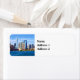 A vibrant Chicago cityscape features a variety of modern skyscrapers and high-rise buildings against a clear blue sky. The foreground is dominated by a calm body of water where boats can be seen.