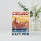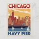 Celebrate the dynamism of the "Windy City" with this vibrant retro travel postcard featuring the Chicago skyline. The design highlights the iconic buildings and the Navy Pier Ferris wheel set against a warm, orange sky. With sailboats cruising on Lake Michigan, this artwork captures the energy and architectural appeal of this major US city in a striking, vintage poster style.
