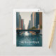 A beautiful graphic illustration capturing the Chicago Riverwalk, featuring stylized skyscrapers, a classic bridge, and the reflective, textured blue water.