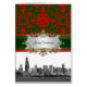 A view of the Chicago Illinois skyline in black and white. It also features a vintage look red and green damask pattern, a red and green ribbon.