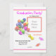 A children's kindergarten or preschool graduation party photo invitation with my digital artwork of a cute little chicken holding a bunch of colourful balloons with graduation caps.