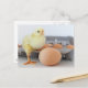 Here's a cute, close up colour photograph showing a very young, newly hatched, fluffy yellow chick standing next to a nice brown egg. Behind the bird is a cardboard carton full of more eggs. Perfect for hatcheries or farmers that incubate and hatch their own poultry for meat or eggs.
